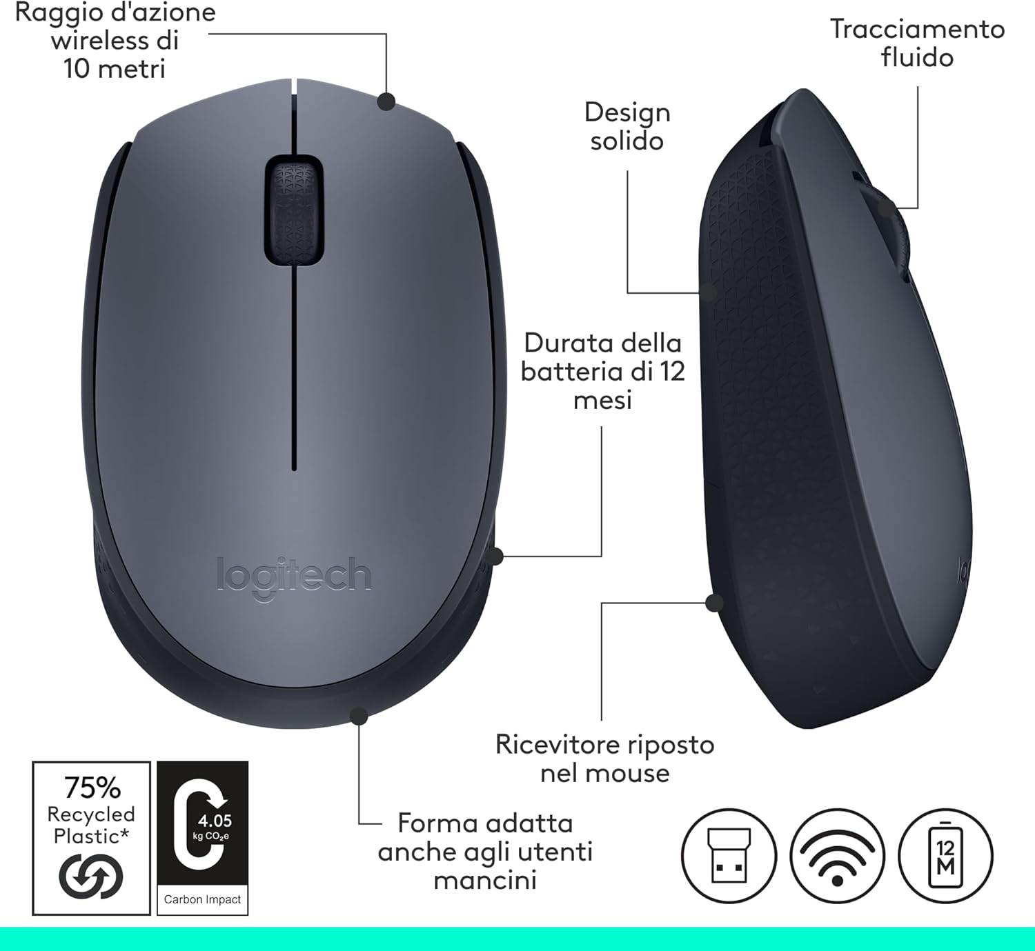 Mouse Logitech M170 Wireless - Grigio Il Logitech M170 rappresenta la soluzione ideale per chi desidera un mouse wireless essenziale e performante. Equipaggiato con tecnologia wireless 2.4 GHz, offre una connessione stabile e priva di latenza fino a 10 metri di distanza. Il ricevitore USB nano si integra discretamente in qualsiasi postazione di lavoro. Grazie all'autonomia estesa della batteria, garantisce settimane di utilizzo intensivo prima della sostituzione. La struttura leggera e il design minimalista lo rendono perfetto per professionisti che prediligono praticità e affidabilità senza fronzoli superflui.